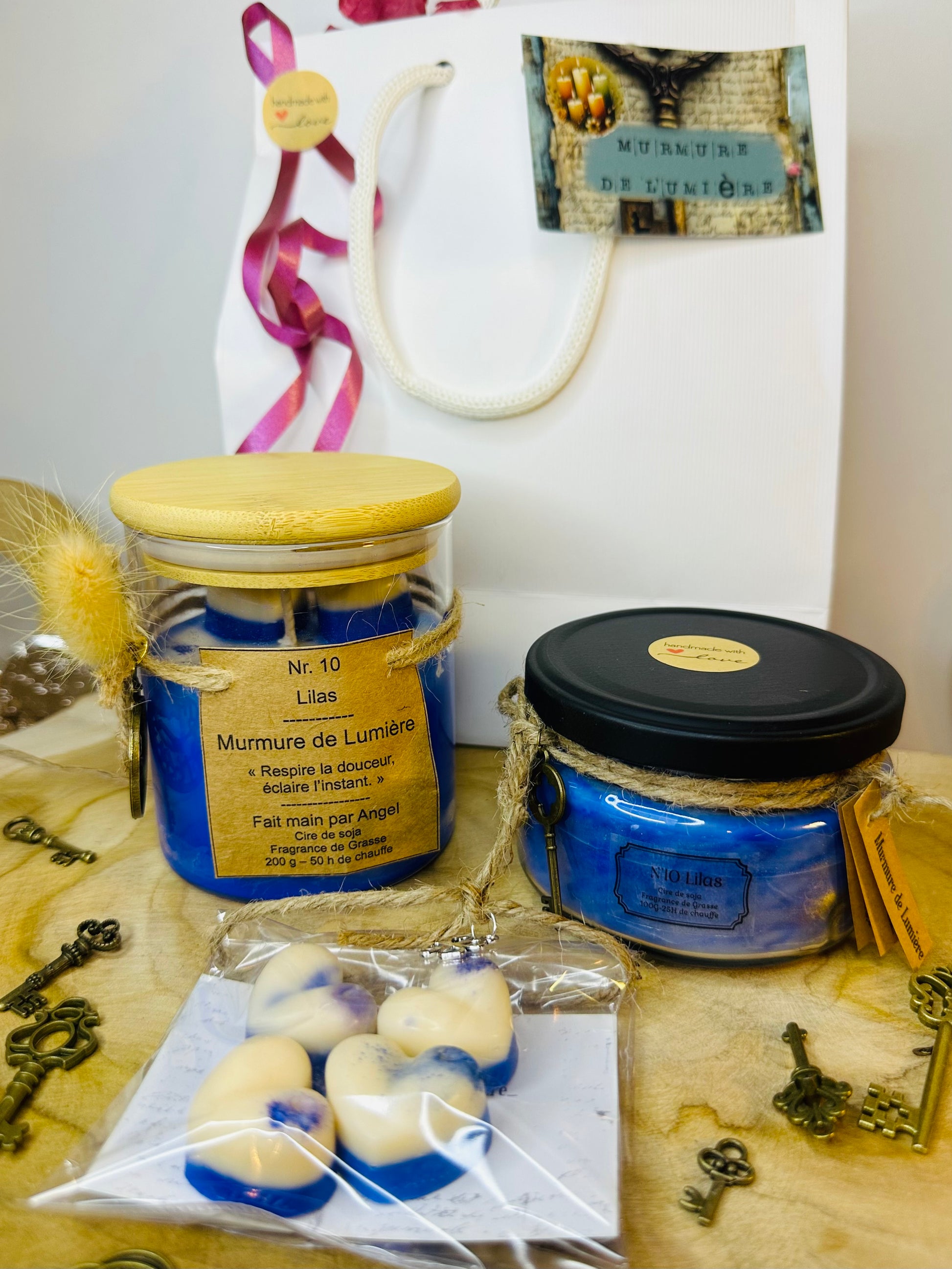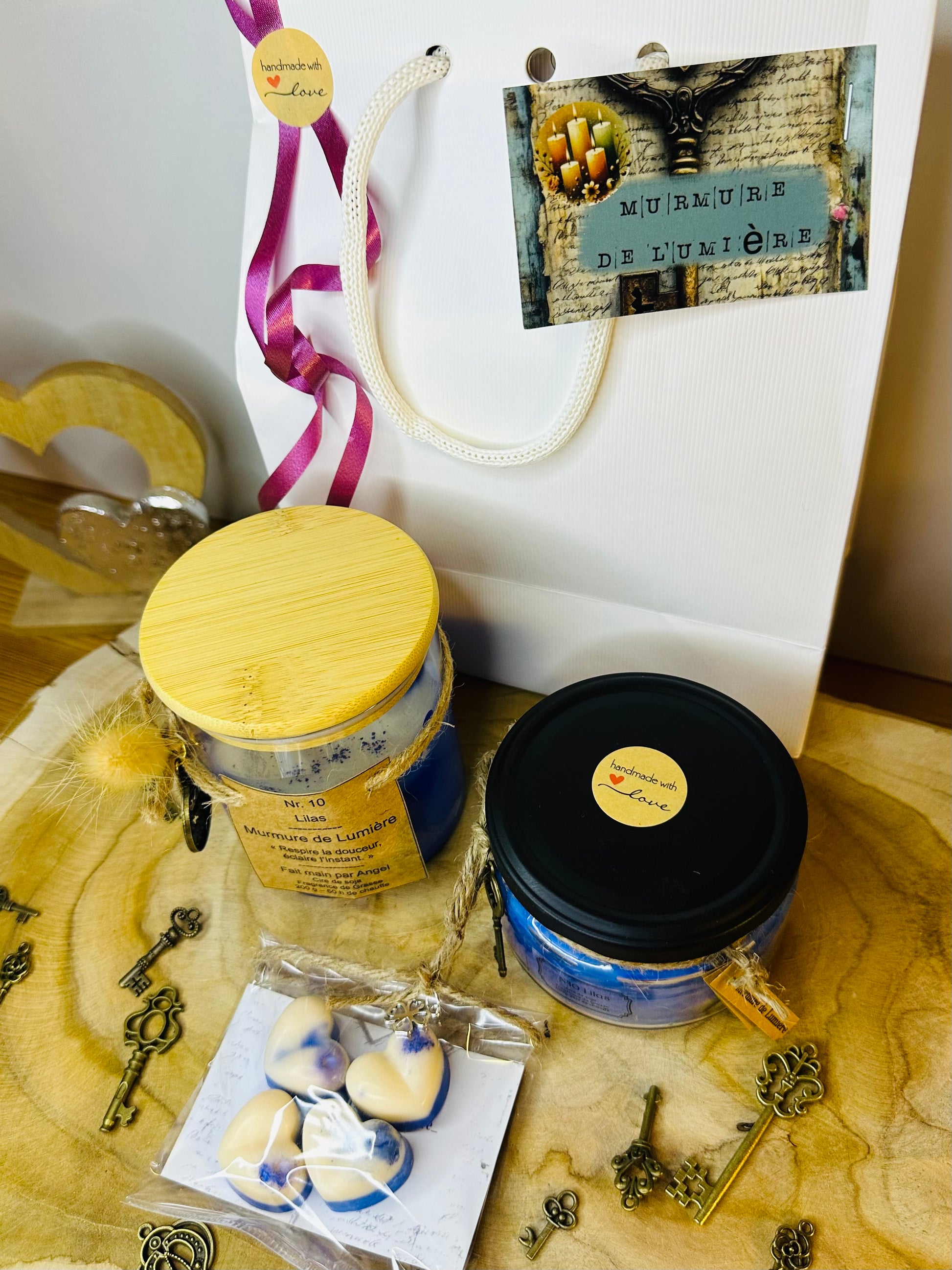 Chaque bougie est coulée à la main, ce qui la rend unique. Son contenant raffiné est décoré d’une clé dorée symbolique, accompagnée d’une breloque décorative. Les breloques peuvent varier, mais elles sont toujours soigneusement assorties dans le même esprit poétique.