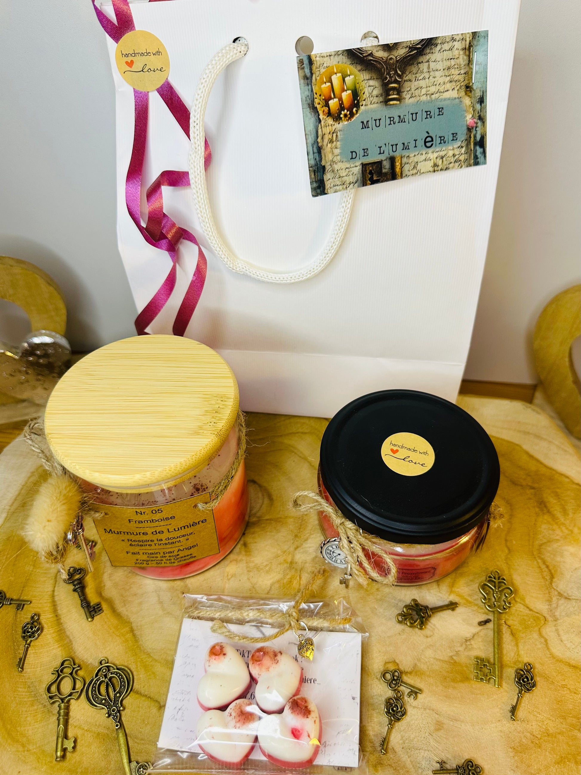 Chaque bougie est coulée à la main, ce qui la rend unique. Son contenant raffiné est décoré d’une clé dorée symbolique, accompagnée d’une breloque décorative soigneusement assortie. Les breloques peuvent varier, ce qui fait de chaque bougie une création artisanale unique.